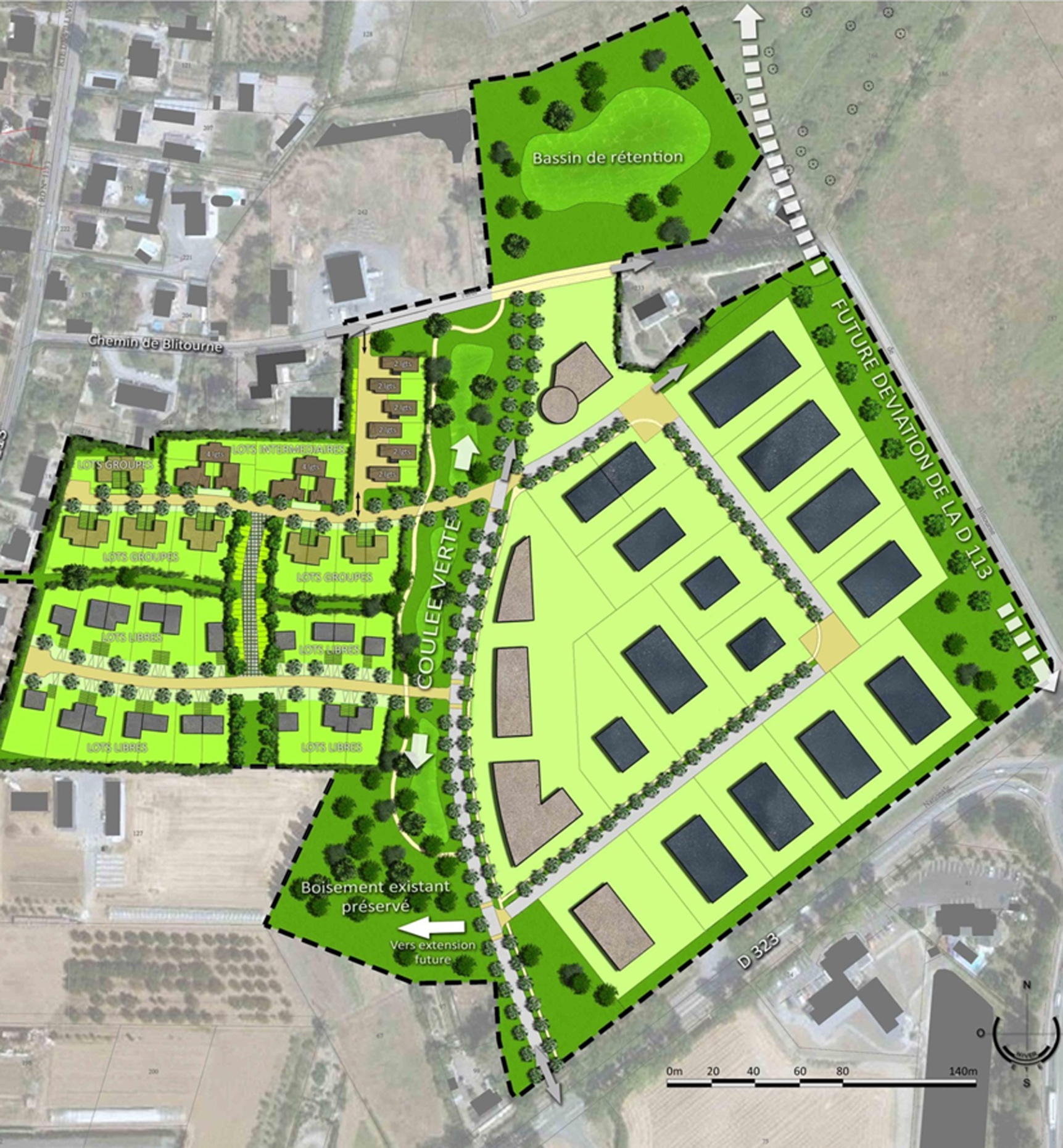 Inscrit dans une démarche de développement durable, ce projet vise à proposer une offre de parcelles d’activités répondant à la demande et une offre de logements diversifiés répondant aux attentes variées et à développer de nouvelles formes urbaines, économes en espaces et respectueuse de l’environnement et du tissu urbain existant.