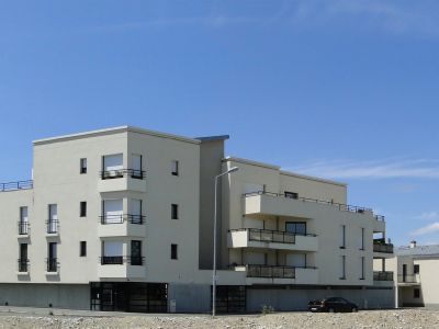 Ces façades seront édifiées en briques alvéolaires en remplissage de l’ossature primaire transversale en béton banché, et revêtues d’un enduit ton pierre très clair à base de chaux allégé, très résistant (type Weber.Lite HR), traité anti-moisissure et anti-mousse.