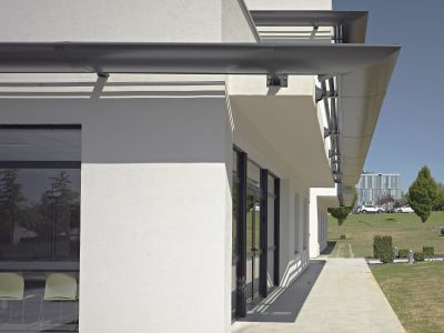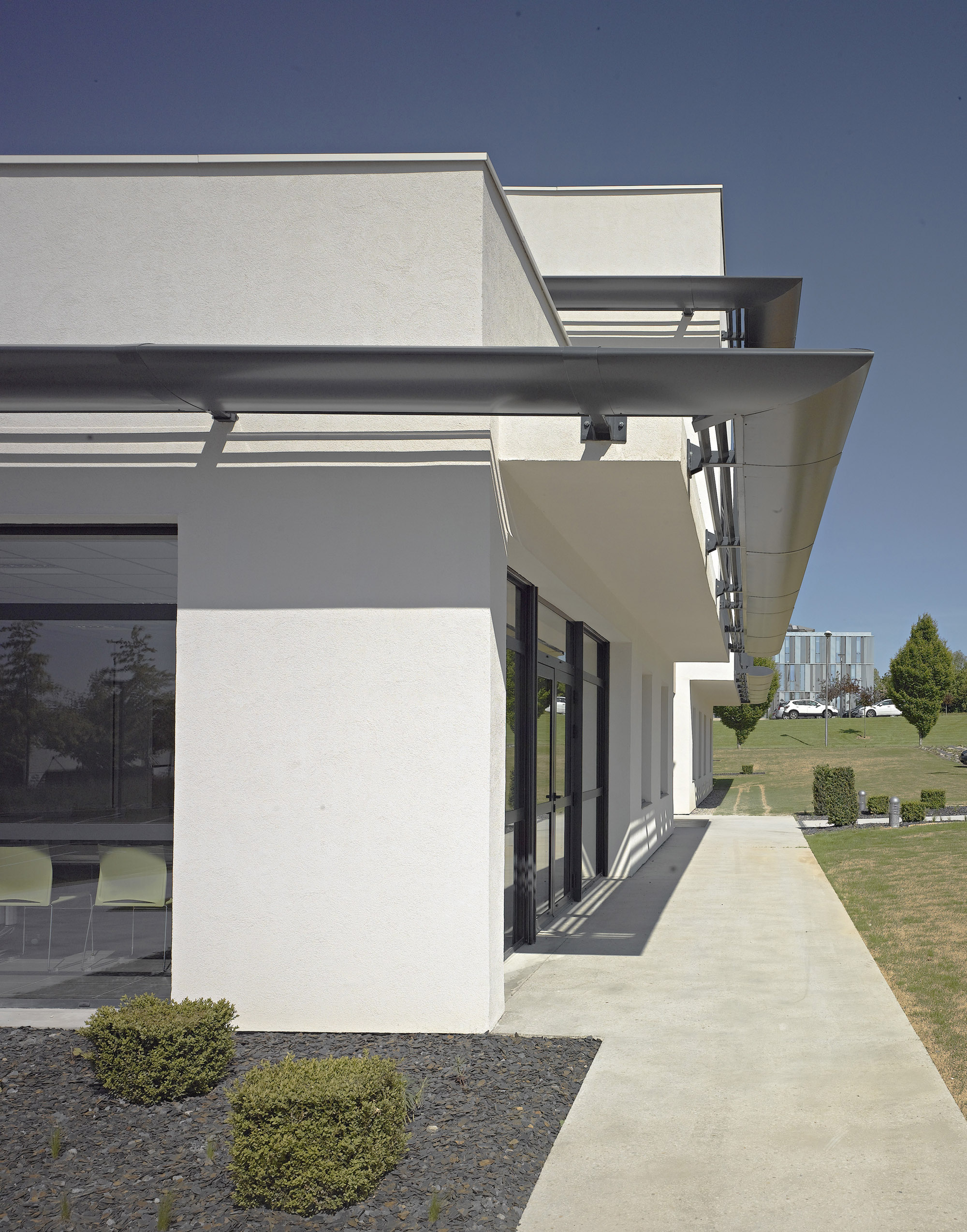 Le bâtiment présente une lecture très sobre au niveau de ses lignes avec des verticales de recoupement faisant office de pare soleil.