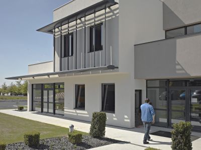 Toujours dans l’esprit de protection solaire, l’étage se trouve en porte à faux protégeant ainsi, grâce à sa projection ombrée le rez-de-chaussée.