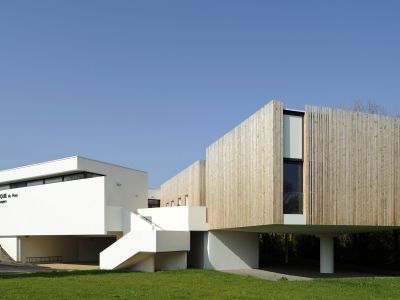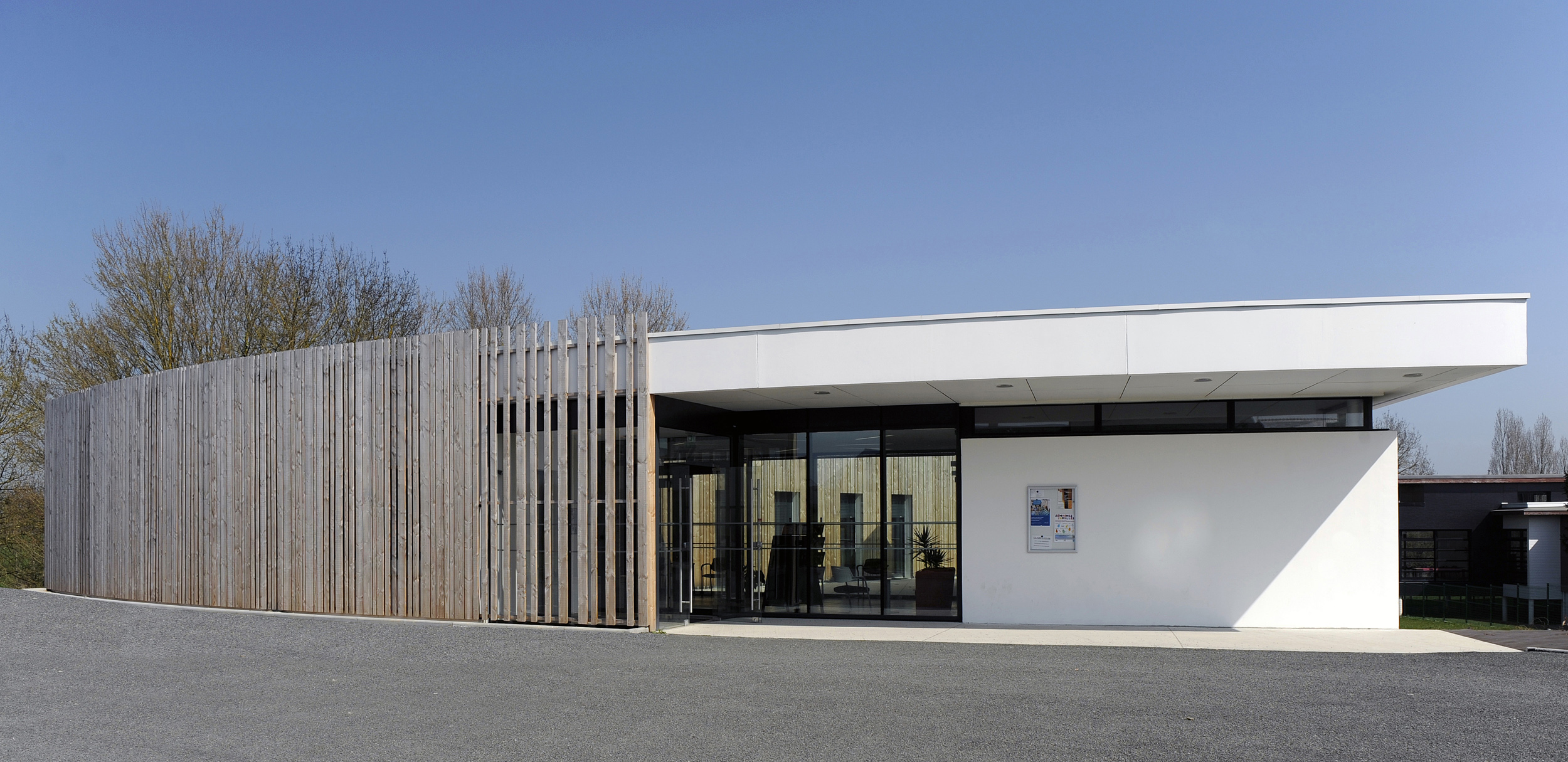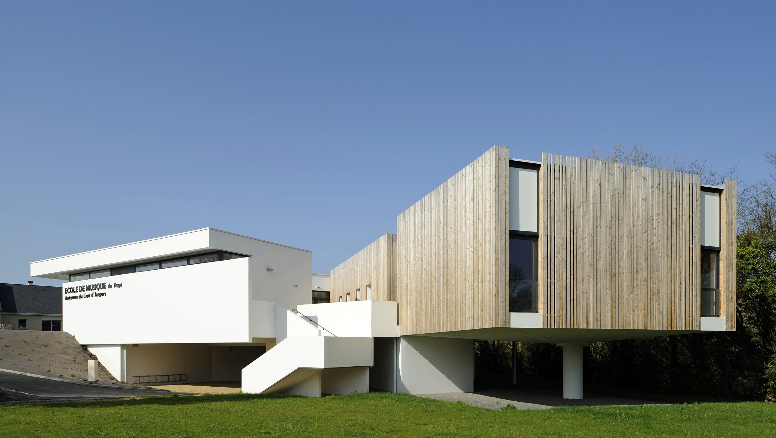 La composition architecturale sobre et rythmée, douce et lumineuse, exprime dans son alternance progressive de bardage ajouré bois et béton blanc, à la fois le lyrisme de sa fonction musicale et la transition paysagère dans un jeu de plein et de vide, de fermé et d’ouvert, de minéral et de végétal.