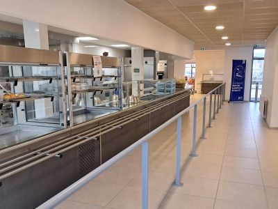 Le reste des bâtiments existants sur RDC et R-1 est complétement remanié car il ne correspond plus aux besoins thermiques et de programme. Une nouvelle cuisine va être complètement revue, avec les locaux du personnel. Ces locaux du personnel vont être partagés entre le personnel des cuisines et le personnel de l’entretien afin de favoriser l’échange et la rencontre. L’accès de ces locaux du personnel est amélioré grâce à une entrée indépendante réalisée par la pose d’un grand mur rideau, facilement reconnaissable depuis l’extérieur.