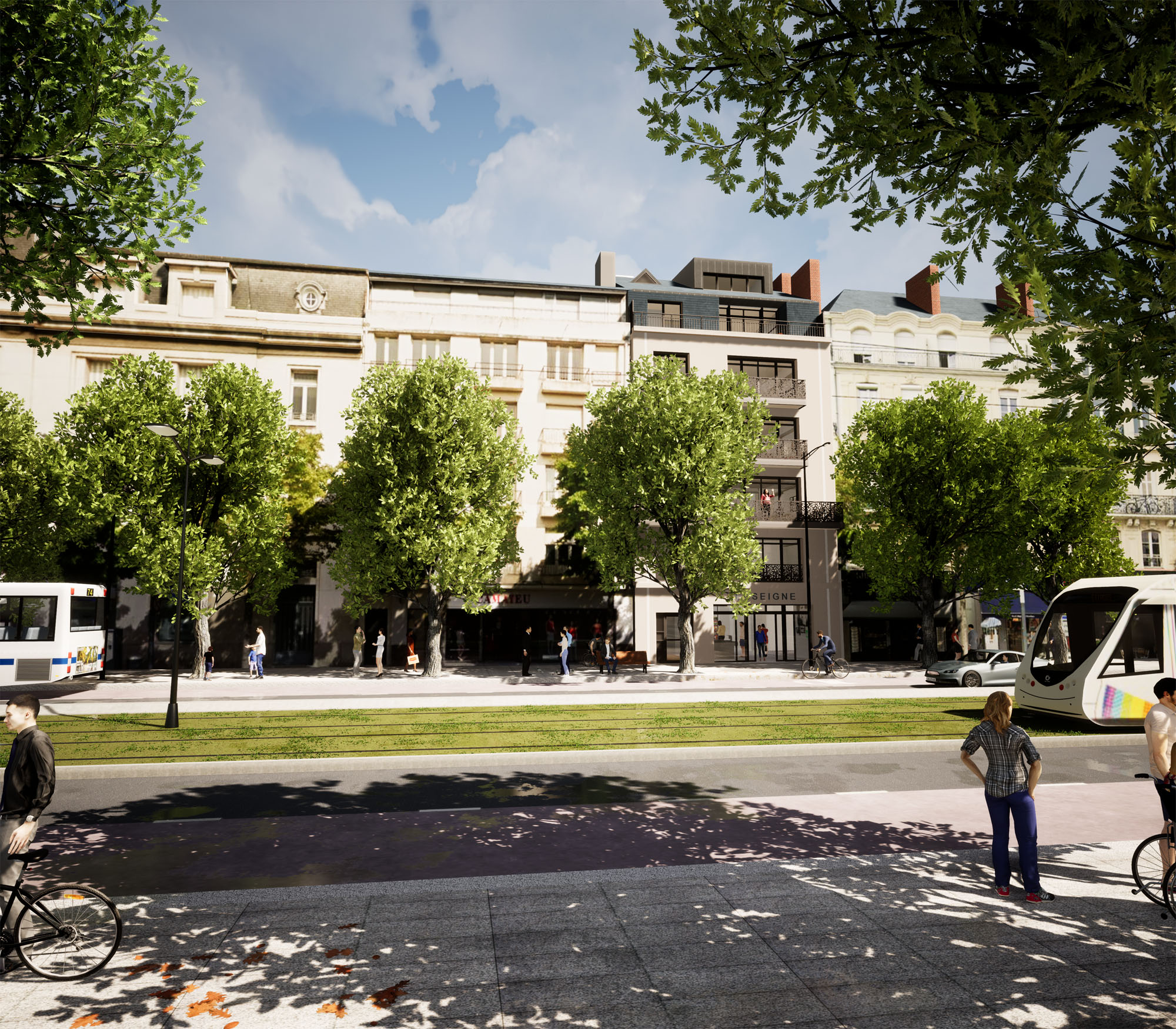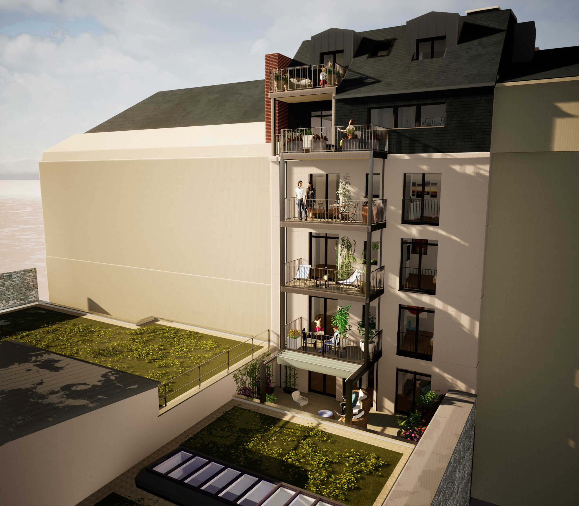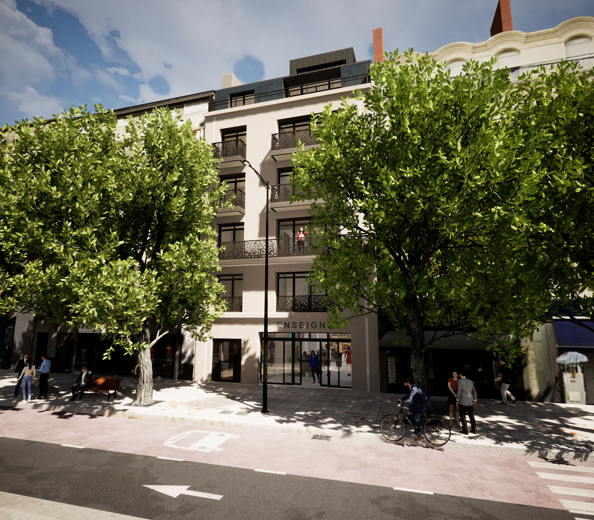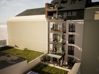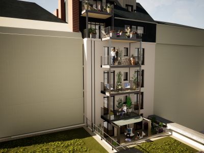 En adéquation avec son environnement, la façade du projet reprend ces principes tout en ayant une écriture de son temps. Les baies, les balcons, les corniches etc sont réalisés dans cette ambiance architecturale avec des matériaux de qualité