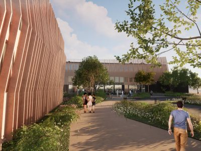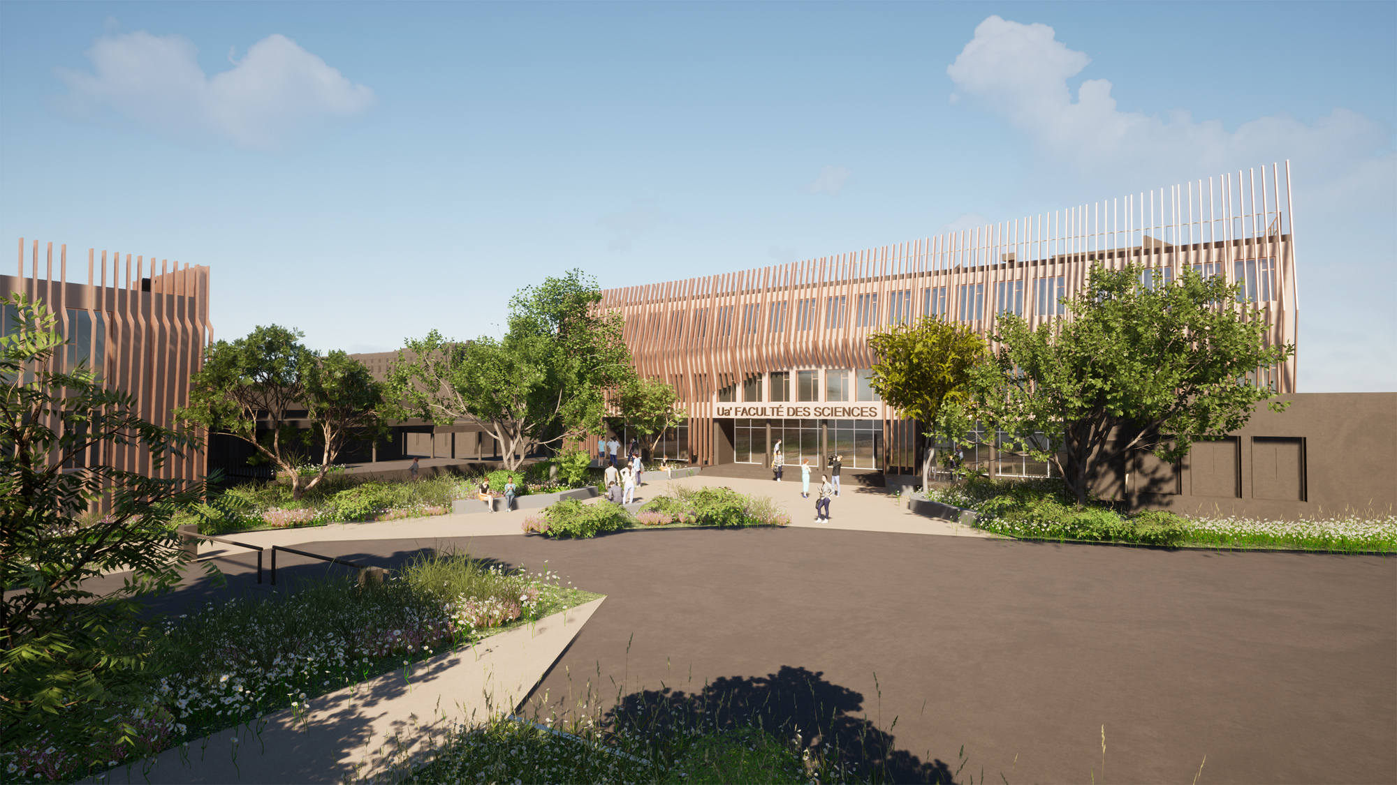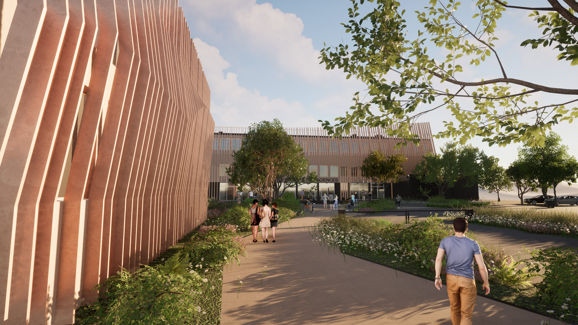Ce parti pris architectural se traduit par des façades vivantes la façade réalisées à l’aide de brises soleil verticaux, qui accompagnent la déambulation sur le site des étudiants.
