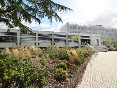 aménagement d’espaces paysagers favorisant l’absorption des eaux pluviales et l’évapotranspiration participant au confort d’été – travail spécifique sur l’ambiance sonore sur la base d’un haut niveau d’absorption. Ambiance feutrée obtenue participant au confort des utilisateurs