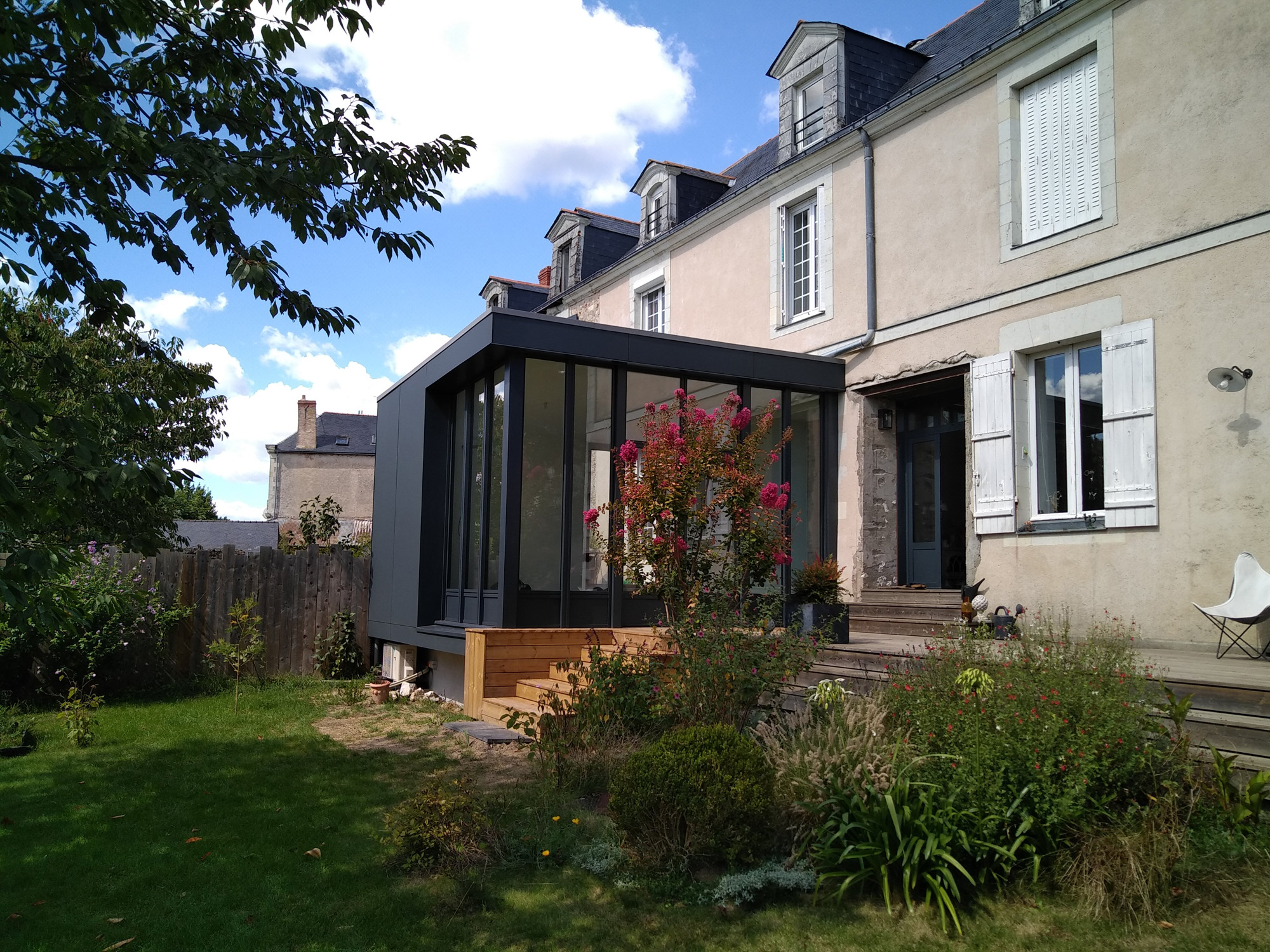 Le bardage choisi est un bardage composite résine / bois dans des tons gris se confondant avec ceux des menuiseries aluminium RAL 7016. L’aménagement extérieur comprend la continuité de la terrasse en bois longeant la façade Sud-Est de l’extension, avec la création de marches rattrapant le niveau du terrain naturel pour accéder au jardin.