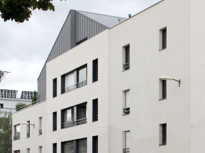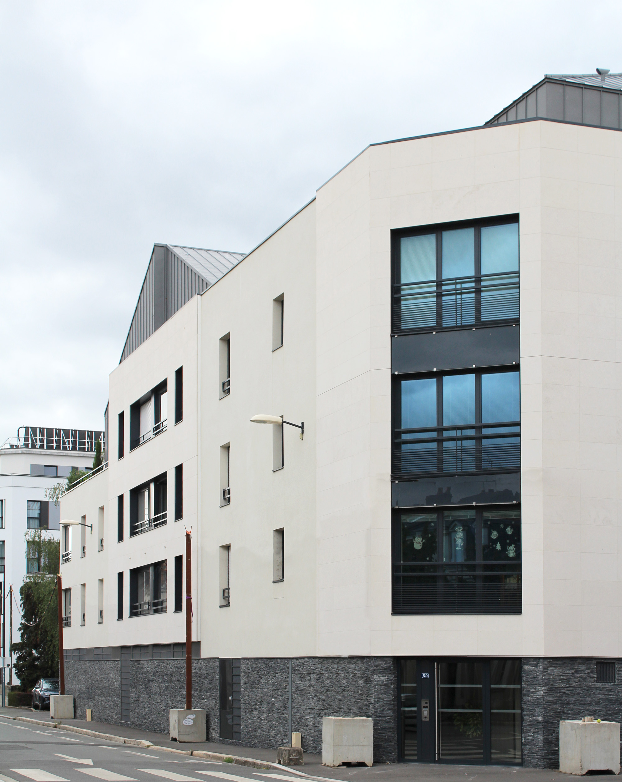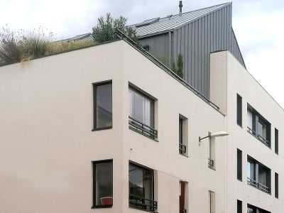 Implanté en L, ce dernier consiste en la création de 19 logements sur un soubassement en schiste. Le bâtiment propose un volume aérien qui bénéficie d’ouvertures à l’Ouest sur l’arrière paysage et à l’Est sur les toitures des maisons « angevines » en double pente ; principe que le projet reprend sur le dernier niveau, en Zinc, dans une volonté d’intégration et d’insertion urbaine.