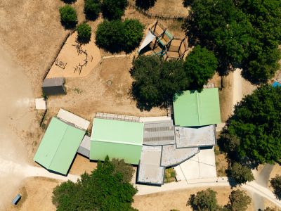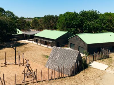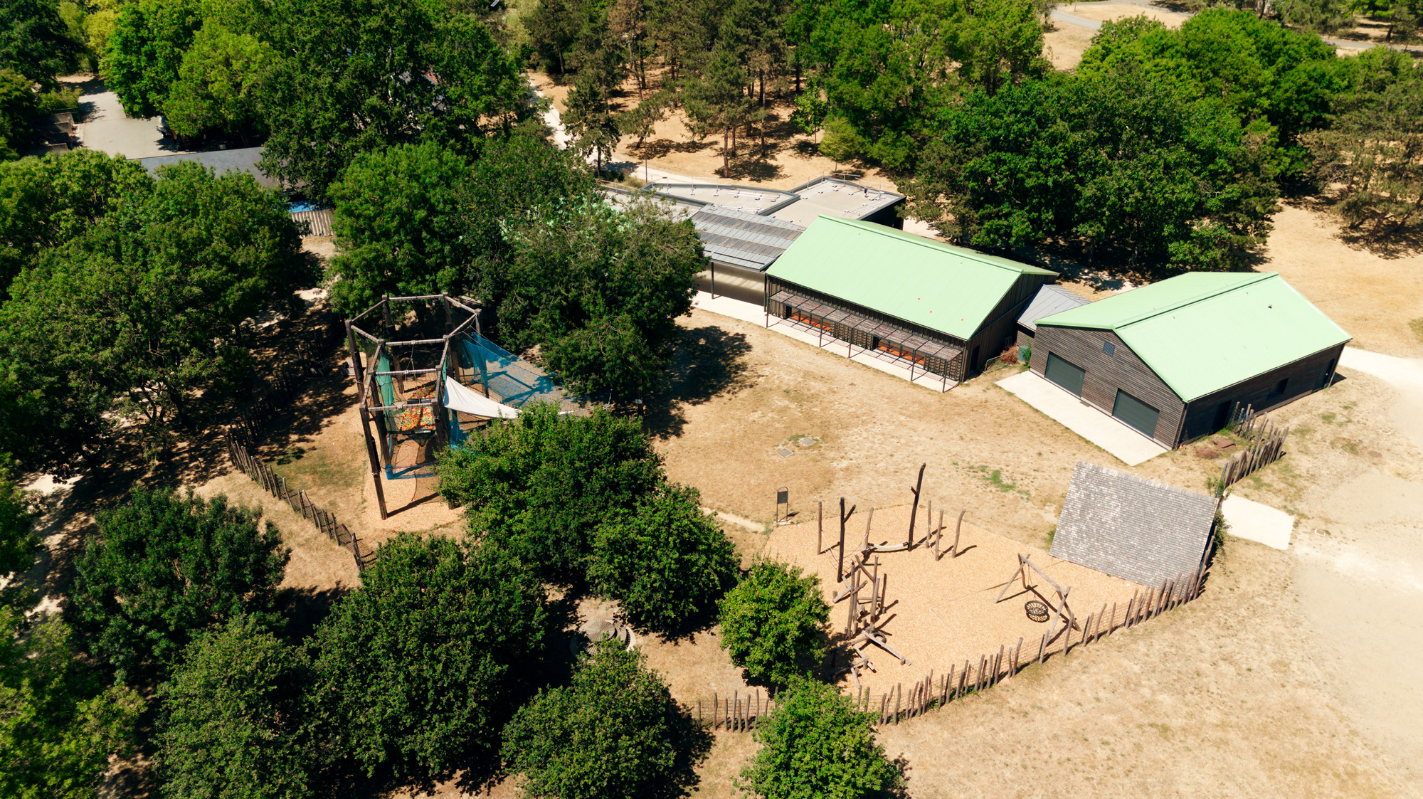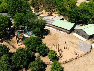 Ces « cabanes », en osmose avec l’environnement, s’articulent entre les arbres existants avec une architecture brute de matière et avec une volumétrie simple.