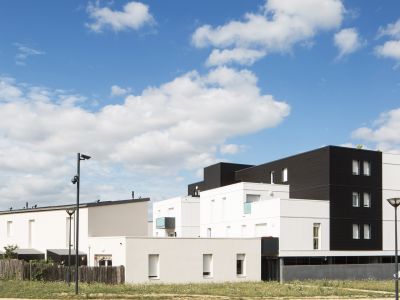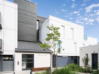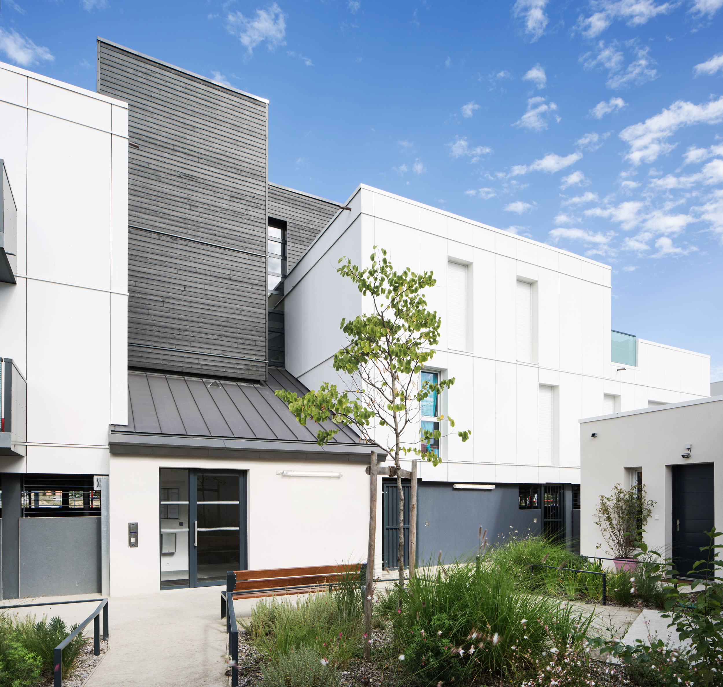 Nous avons privilégié une architecture sobre et discrète mais aussi intimiste de par leurs abris jardins positionnés telles que des pare-vue. Les maisons sont couvertes en grande partie par une simple toiture mono pente zinc afin de leur octroyer une vertu architecturale « domestique ».