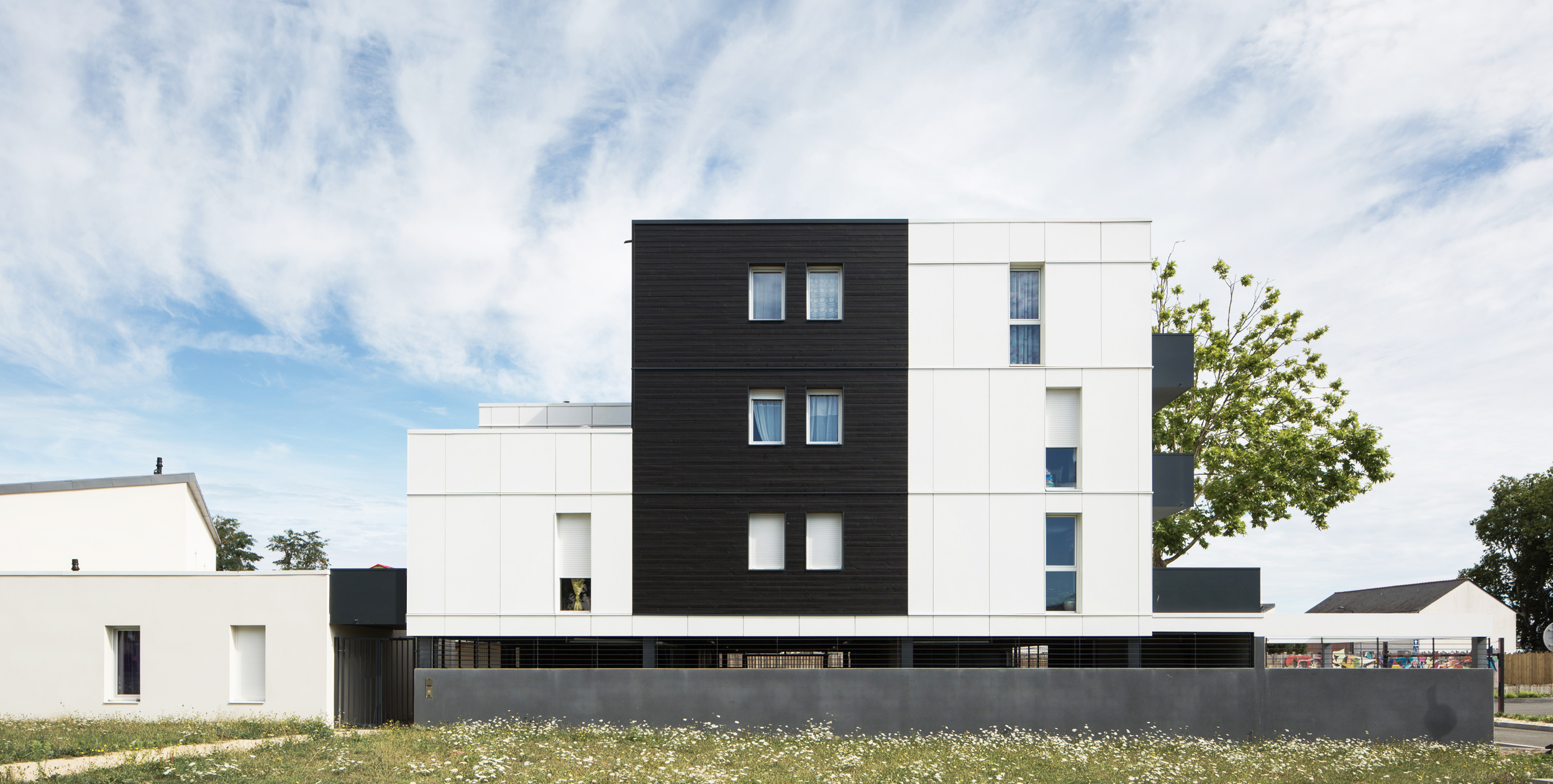Les façades en murs mixtes bardage bois ton noir vanille et panneaux minéraux blanc cassé, ponctuées de balcons bleus pastel diffusent une élégance à la fois sobre et discrète.