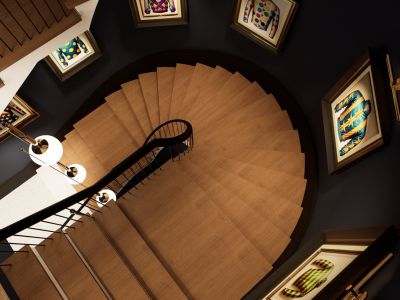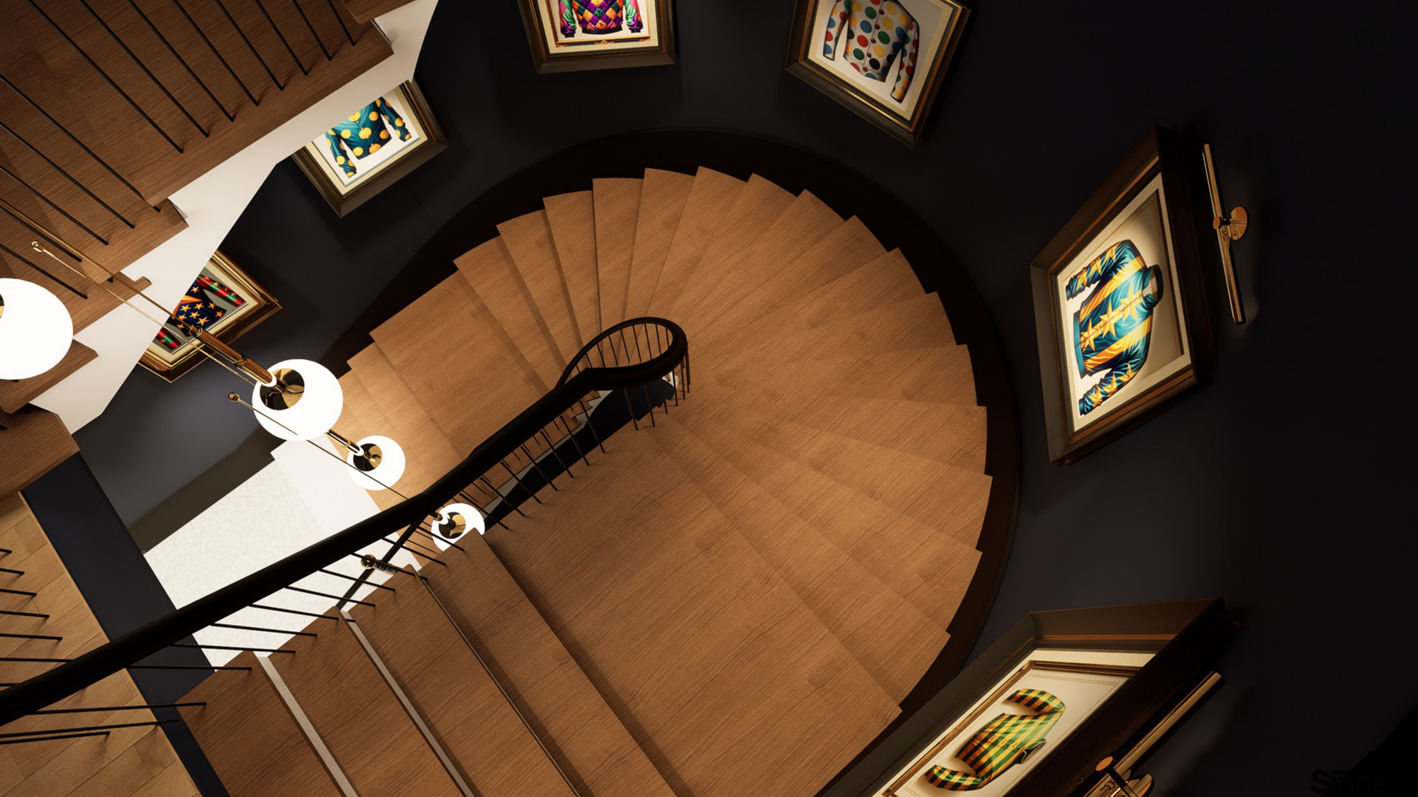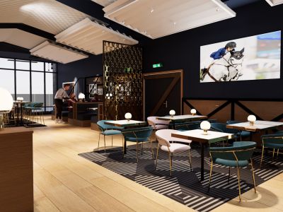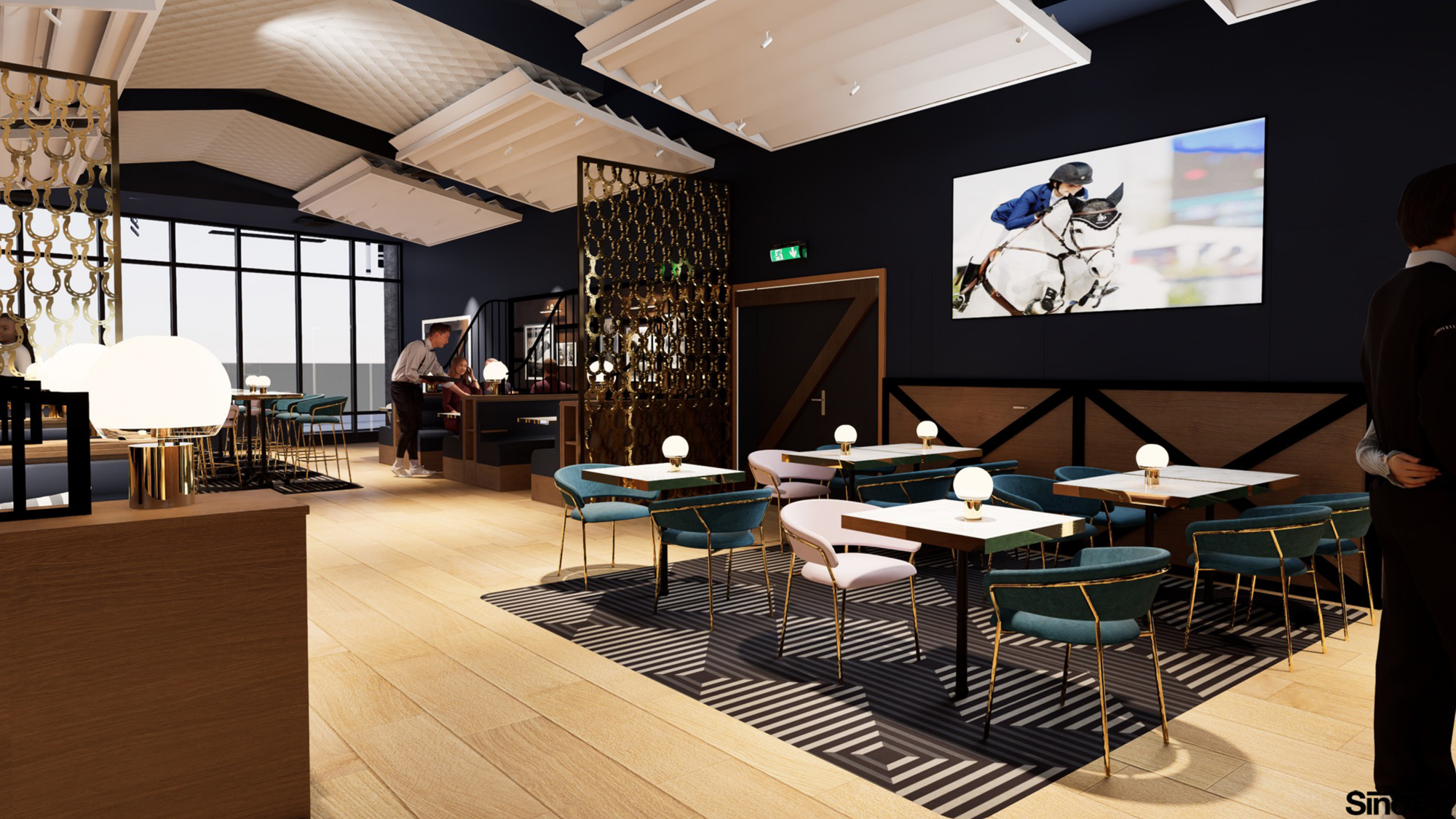A l’intérieur, nous retrouvons un généreux restaurant et bar des sports en RDC. Ils s’implantent de manière à former une rue centrale, ouvert de part et d’autre, symbole des écuries. Ce passage couvert, dialogue avec un hall élégant et généreux qui distribue également les étages, via un escalier monumental traité en matériaux nobles, tout comme l’ensemble du projet.